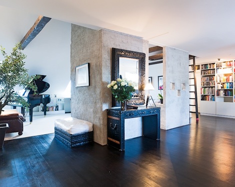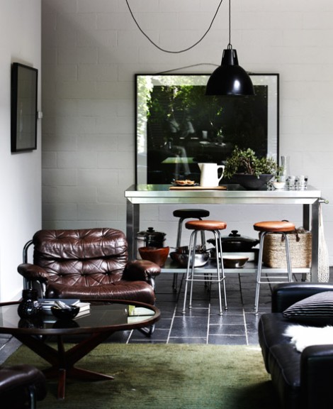 Kattoparrut ovat omiaan tässä tilassa. Niihin voi helposti myös asettaa roikkumaan valaisimia ym. ajankohtaisia sisustuskoristeita. Musta lattia ja kiviseinä antavat tilalle särmää ja lämpöä, kauniisti muuratusta takasta puhumattakaan.